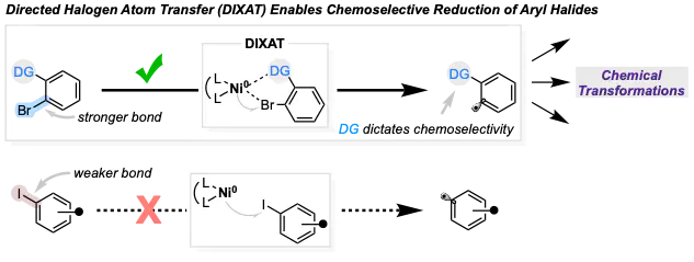 Halogen atom transfer (XAT) and single electron transfer (SET) have emerged as versatile tools for the generation of aryl radicals. The intrinsic reactivity of these methods is governed by bond dissociation energies (BDEs) and reduction potentials, respectively, which typically favor activation of an aryl iodide over an aryl bromide. To date, no existing methods have overturned these inherent reactivity trends. The newly developed strategy, a directed halogen atom transfer (DIXAT), overcomes the above reactivity trends by enabling a chemoselective activation of aryl bromides bearing an ortho directing group, even in the presence of otherwise more reactive aryl iodides. This approach allows for precise control over aryl radical generation based on spatial orientation rather than redox or bond strength considerations. We have harnessed this novel technique to conduct nickel-catalyzed arylation and cascade carboarylation of the rremote C(sp3)–H bonds of aliphatic amines.