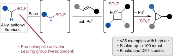 Here we present the ambiphilic reactivity of alkyl sulfonyl fluorides in the stereoselective synthesis of diverse cyclopropanes from olefins, under palladium(II) catalysis. The sulfonyl fluoride functionality serves as both an acidifying group and an internal oxidant within the ambiphile, enabling successive carbopalladation and oxidative addition steps in the catalytic cycle, respectively. The transformation grants access to cis-substituted cyclopropanes and exhibits broad compatibility with various alkyl sulfonyl fluorides, including those bearing –CN, –CO2R, isoxazolyl, pyrazolyl and aryl groups. With internal alkene substrates, 1,2,3-trisubstituted cyclopropanes that are otherwise challenging to synthesize are formed in good-to-moderate yields and predictable diastereoselectivity. Detailed mechanistic insights from reaction progress kinetic analysis and density functional theory calculations reveal that the SN2-type C–SO2F oxidative addition is the turnover-limiting and diastereoselectivity-determining step.