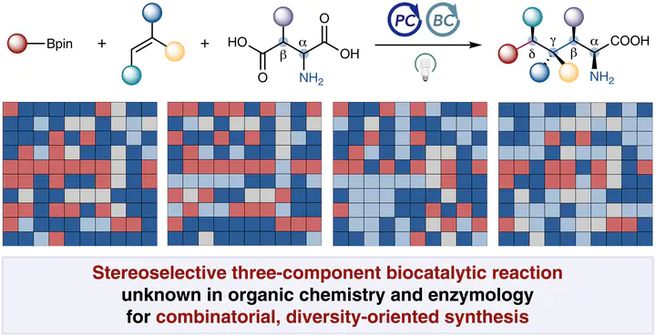 Enzymatic multicomponent C–C bond forming reactions for diversity-oriented synthesis remain rare. Using cooperative photobiocatalysis, we developed a stereoselective three-component radical-mediated C–C coupling unknown in both organic chemistry and biochemistry. Directed evolution of repurposed pyridoxal decarboxylases enabled full fragment variability in this three-component coupling, giving rise to six classes of valuable products, many of which were inaccessible by other methods, even in a racemic fashion. This enzymatic platform integrates a range of asymmetric catalysis principles, including remote stereocenter construction, stereodivergent catalysis, kinetic resolution and parallel kinetic resolution, achieving excellent diastereo- and enantiocontrol over radical intermediates. The broad substrate scope and complementary specificities of evolved enzyme variants enabled combinatorial library synthesis, affording structurally and stereochemically diverse scaffolds for medicinal chemistry.